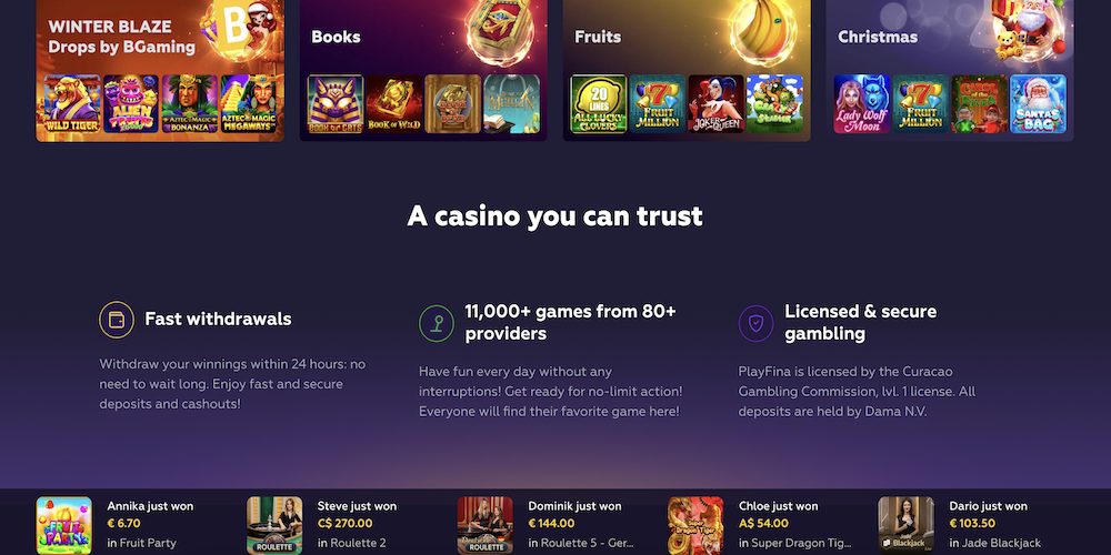 Playfina offers a wide variety of games, including slots, table games, live casino games, and more. Users can enjoy popular titles such as blackjack, roulette, poker, and hundreds of different slot games.