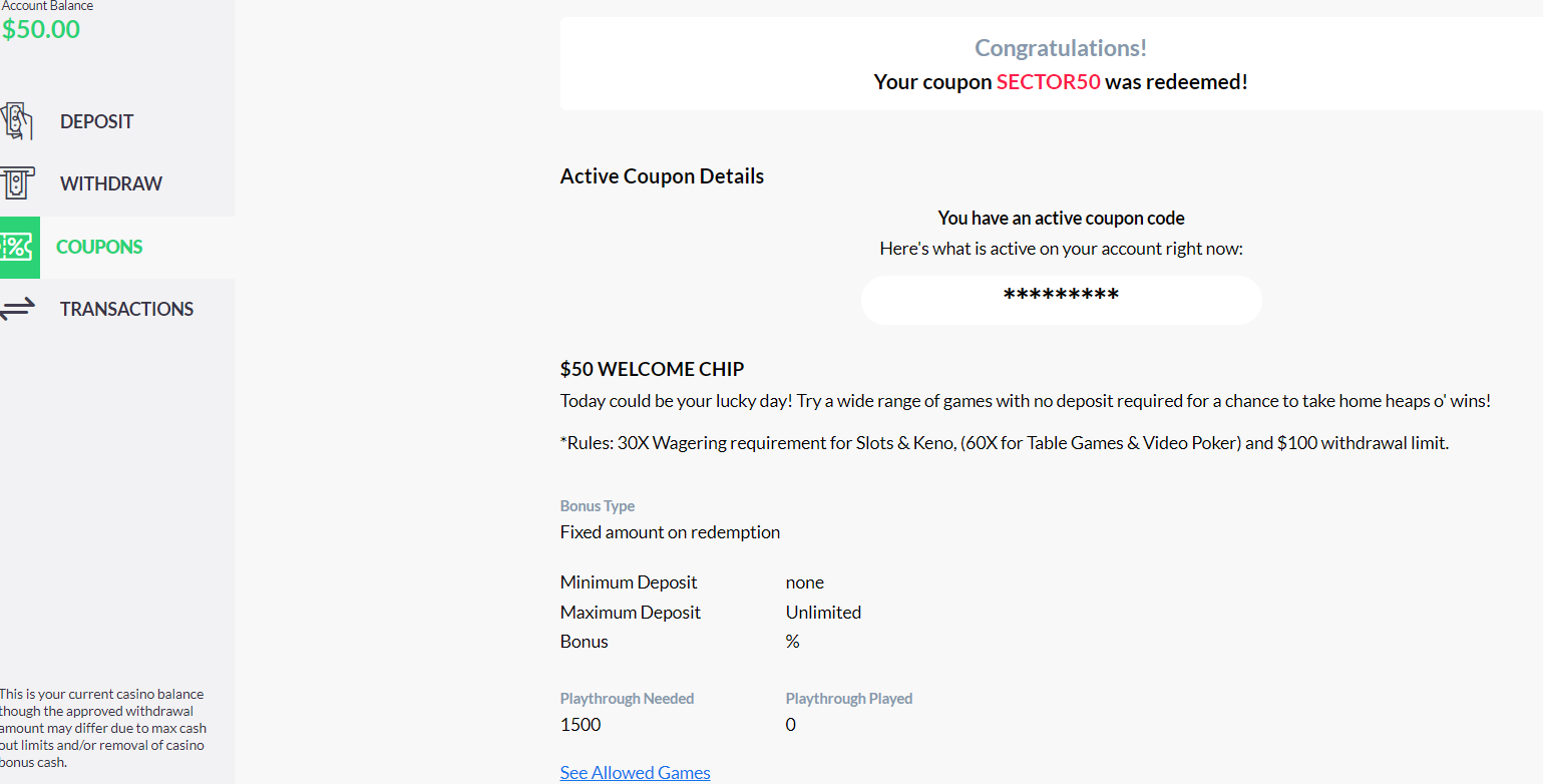 - Valid for registered players only - Minimum deposit of $50 required