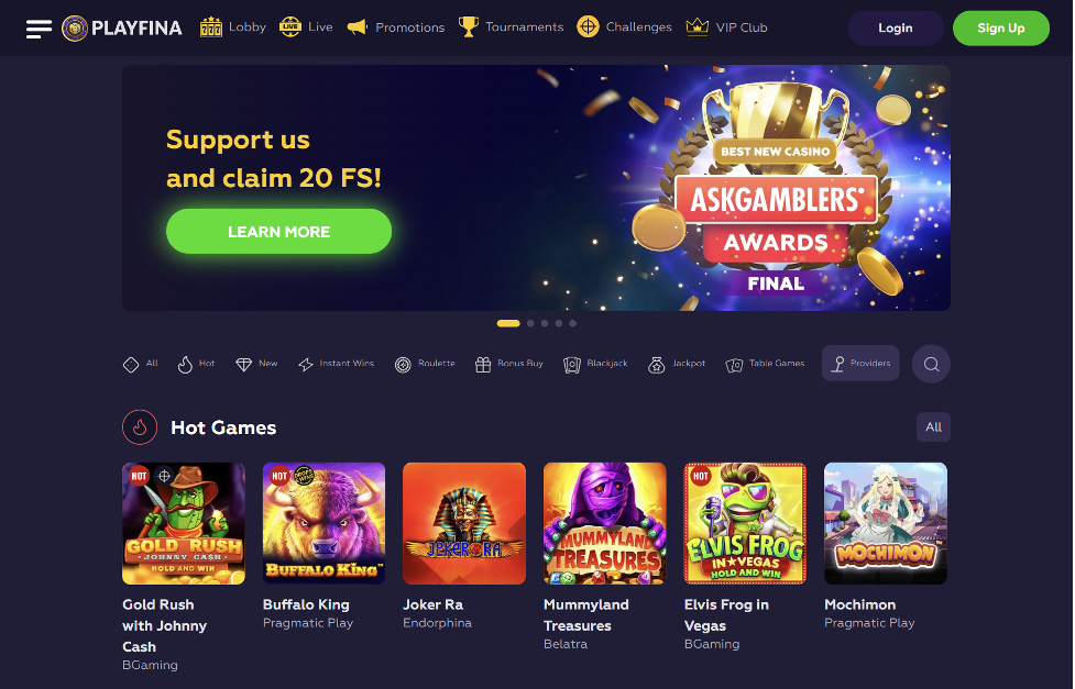 More than 11,000 slots, all varieties of blackjack, dozens of roulette games, craps, video poker, and other games are available to you at Playfina casino online Unleash the Excitement - Embark on a Thrilling Gaming Journey with Playfina Promo Codes! Play the Best Online Casino Games at Playfina ✓ Try Slots, Blackjack, Roulette, Craps and Video Poker with Huge Bonuses. Playfina Casino How to Start Up to 1000€ + 200 FS + Secret Bonus... Playfina Casino - Bonus Codes – 50 Free Spins!