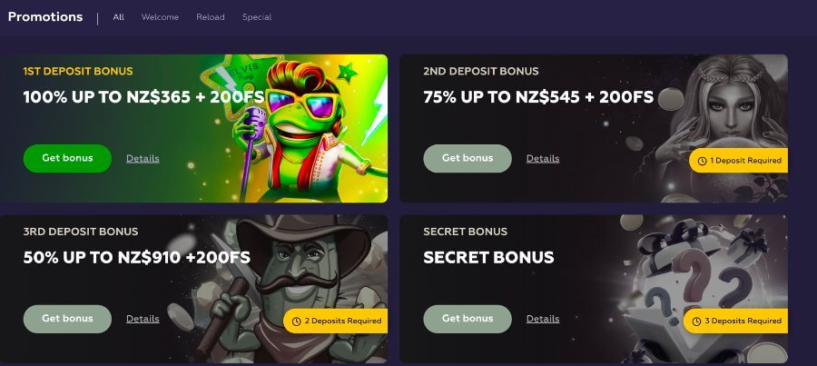 Reload bonuses, cashback offers, free spins, etc.