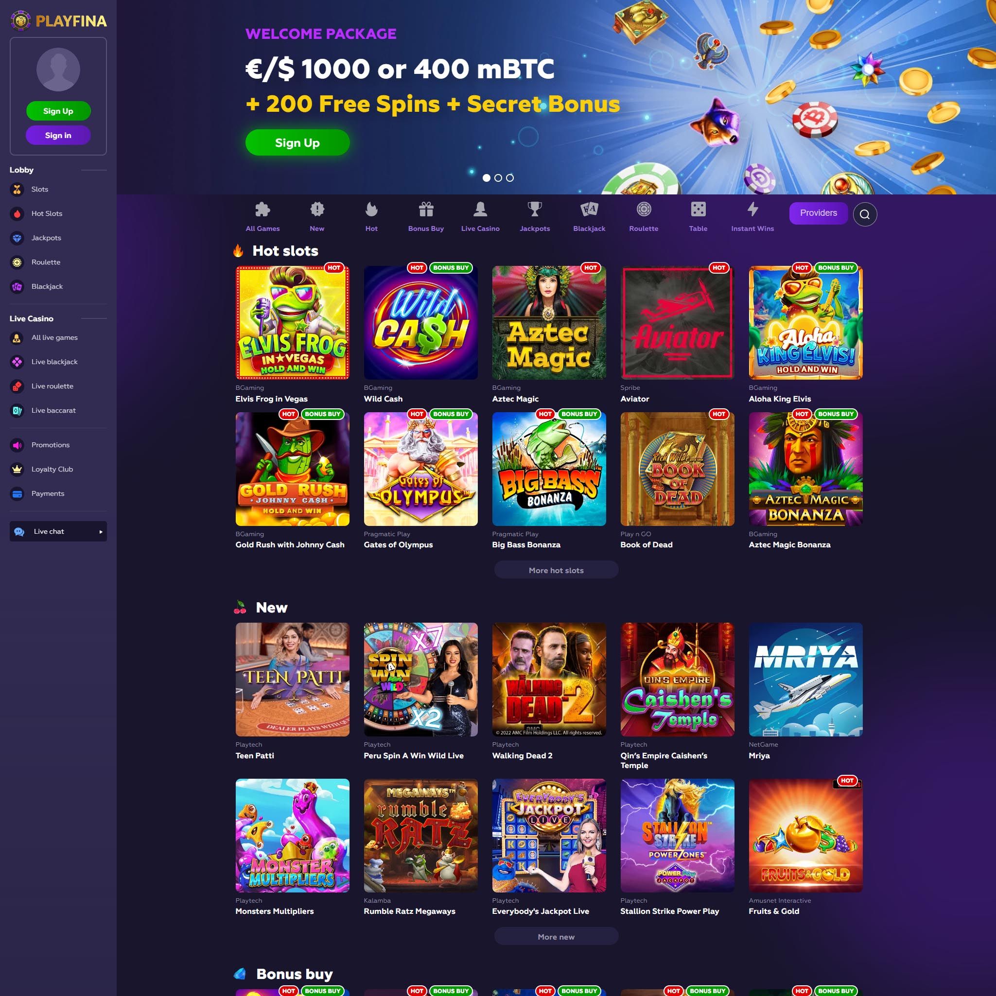 More than 11,000 slots, all varieties of blackjack, dozens of roulette games, craps, video poker, and other games are available to you at Playfina casino online Winning Strategies at Playfina Casino! Play the Best Online Casino Games at Playfina ✓ Try Slots, Blackjack, Roulette, Craps and Video Poker with Huge Bonuses. Playfina Casino How to Start Up to 1000€ + 200 FS + Secret Bonus... Playfina Casino - Bonus Codes – 50 Free Spins!